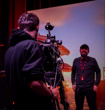 À chaque édition, Kijk in de Vegte et son équipe essaient d’affiner et d’améliorer certaines parties du programme, la plupart du temps poussés par les retours qui sont toujours demandés aux participants après l’évènement. Par exemple, pour l’édition 2019, nous avons décidé de différencier le contenu : Nous avons alors mis en place une journée avec un aperçu général et une autre, qui a été mise en place pour le personnel avancé dans la technologie de l’évènement. Un jour, les thèmes de l’affichage, de la caméra, de la régie et du numérique passaient par des approches purement simplifiées. L’édition de décembre 2022 comprendra une journée en anglais. Kijk in de Vegte : Le programme est toutefois resté interactif les deux jours ; Faber considère que c’est une condition importante de son succès. Après la partie commune du matin, les invités se promènent avec nous dans les locaux de l’entreprise et, en chemin, on leur montre tout, de la maintenance à la réparation des panneaux LED. Mais ils acquièrent aussi eux-mêmes des impressions avec la réalité virtuelle, le fond vert et les caméras, par exemple. Dans le studio transformé en étage de démonstration spécialement pour l’occasion, les spécialistes montrent de nombreux exemples de la pratique audiovisuelle. La partie plénière est, logiquement, enregistrée par une caméra. Un mur LED haut de gamme et incurvé a été utilisé pour la présentation.